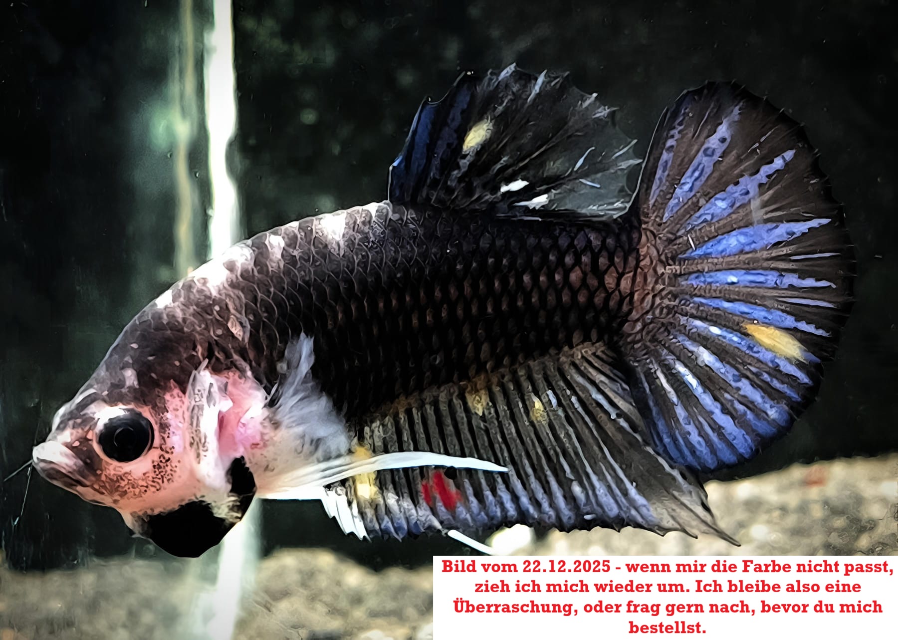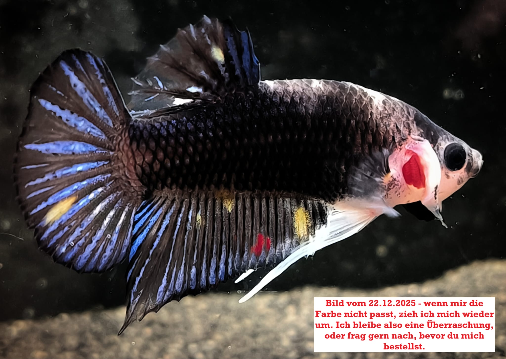 Unser Betta splendens "Damion" ist ein Jungtier von April 2025 und ist eine ganz besondere Zuchtform, die blaue Glanzschuppen ausweist. Diese Zuchtform hat eine tief schwarze Grundfarbe, blaue Glanzschuppen und rote Farbakzente in den Flossen. Diese Linie stammt aus einer Selektionszucht und ist etwas Besonderes. Er ist ein Marble Tier und und somit kann sich seine Farbe im Laufe seines Lebens verändern.
