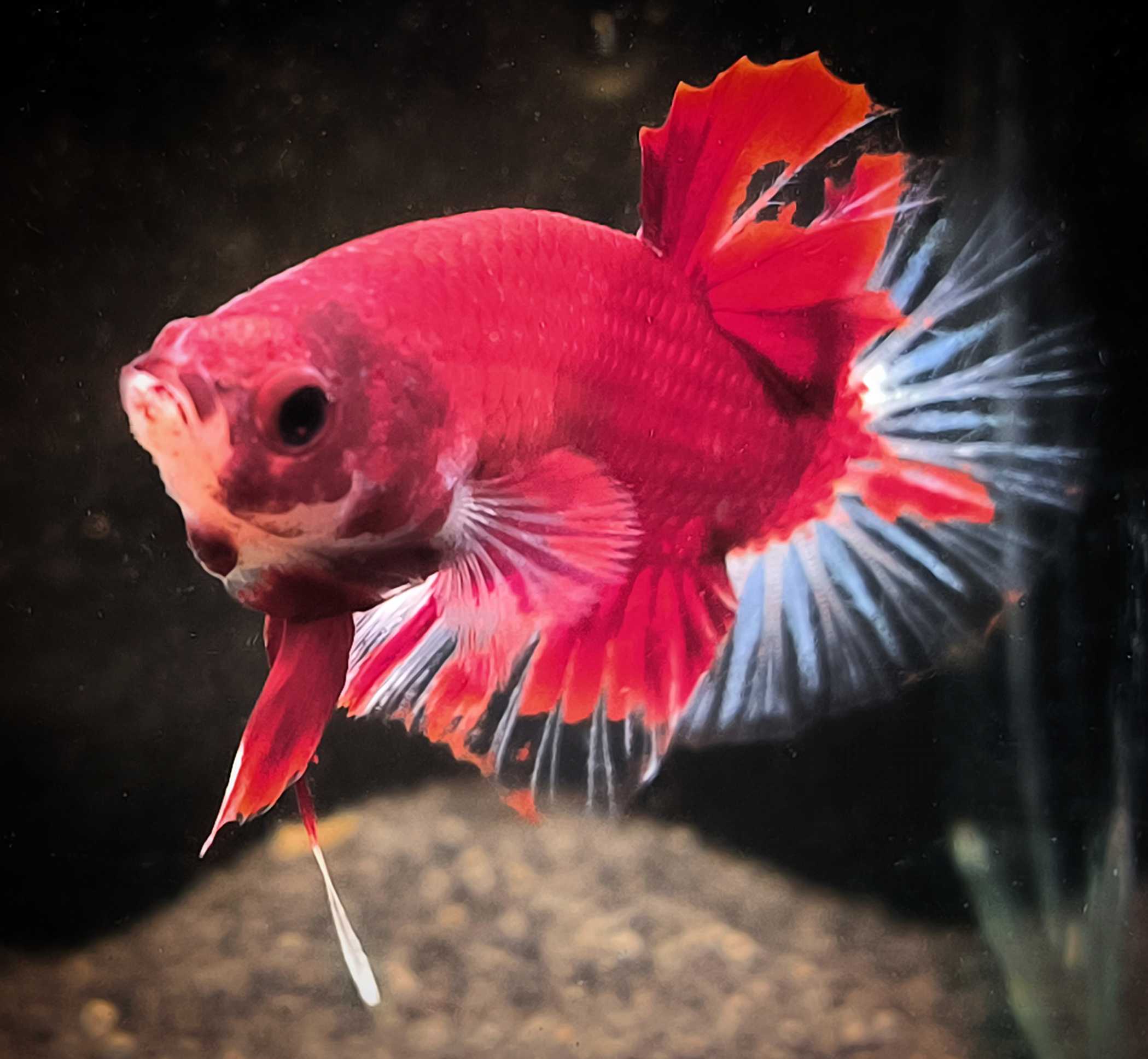 Unser Betta splendens "Solembum" ist ein Jungtier von November 2025 und ist aus einer Red heart. Er hat aktuell eine wunderschöne weiss-rot Farbe.